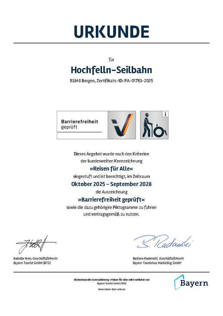 Die Hochfelln-Seilbahn wurde nach den Kriterien der bundesweiten Kennzeichnung »Reisen für Alle« eingestuft und ist berechtigt, im Zeitraum Oktober 2025 - September 2028 die Auszeichnung»Barrierefreiheit geprüft« sowie die dazu gehörigen Piktogramme zu führen und vertragsgemäß zu nutzen.